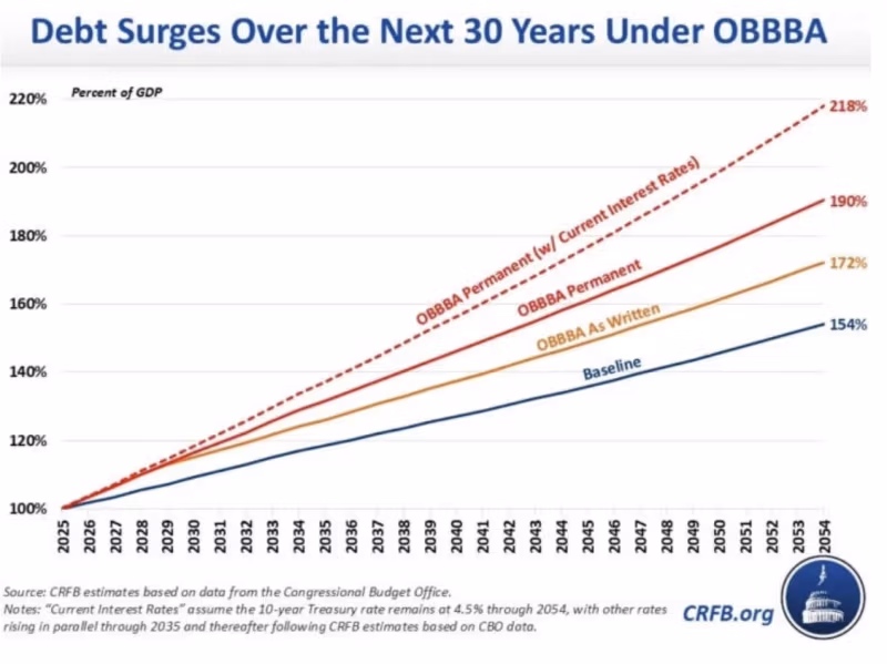 无论如何,在 30 年的基础上,OBBBA 的书面内容将增加 $ 117 万亿 公共债务将增加到$ 133 万亿 当你不考虑会计技巧,就能计算出OBBBA的价格时。现在,有人认为在未来29年内将公共债务从162万亿美元增加五倍至XNUMX万亿美元是一条通往繁荣黄金时代的可行之路,这实际上远远超出了我们的想象。