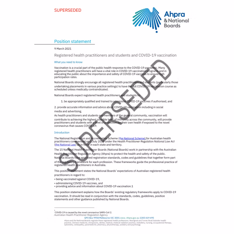 当被要求澄清被取代的 (2021) 立场声明与新立场声明之间的差异时,AHPRA 发言人建议:
