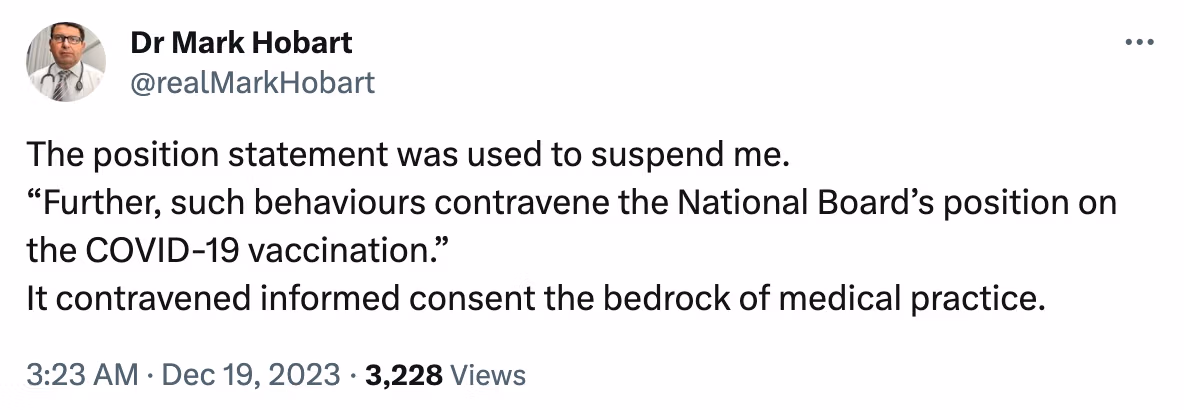 可以对轻微的“罪行”发起调查,例如发布政治内容和有关整体健康的一般信息,例如 莎莉·普赖斯博士。因更严重违反 AHPRA 立场声明的行为而被暂停,例如在以下情况下向患者发放医疗豁免: 马克·霍巴特博士和邓肯·赛姆博士,或在标签外开伊维菌素,就像以前那样 美乐贞博士 (所有三名医生仍无限期停职)。